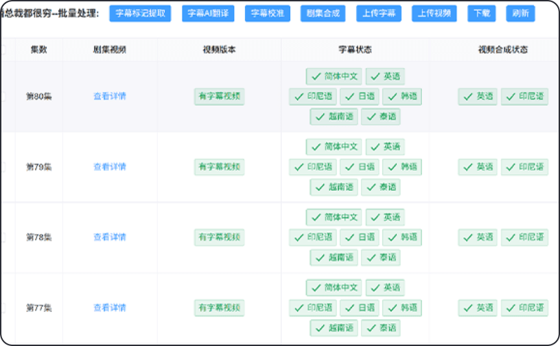 一键批量完成字幕提取、AI翻译、字幕校准、AI配音、剧集合成,语种覆盖英语、印尼语、日语、韩语、越南语、泰语等